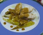 Retira el pescado y la verdura, reserva y mantiene caliente. En la misma sartén, coloca el vino blanco, el vinagre, el agua y el jugo del pescado. Reduce y liga con la fécula.