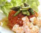24 langostinos • 8 cogollos • 2 tomates • 12 espárragos verdes • 12 ajos frescos • agua • aceite virgen extra • vinagre de Módena • sal